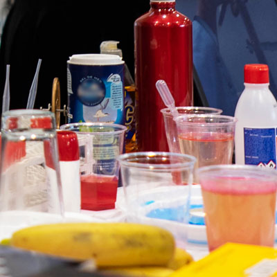 – au choix du public : dans ce cas une dizaine d’objets du quotidien sont présentés au public, chacun d’entre eux étant associé à une expérience… tenue secrète jusqu’à ce que l’objet soit choisi ! Jusqu’à 8 expériences peuvent ainsi être réalisées en une heure.